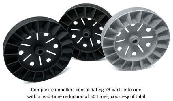該報(bào)告包括一個(gè)涉及全球制造服務(wù)公司的案例研究——捷普科技,詳細(xì)介紹了其使用增材制造來重新設(shè)計(jì)葉輪的過程。通常,需要手動(dòng)組裝73個(gè)金屬零件,而3D打印葉輪由纖維增強(qiáng)的聚合物復(fù)合材料制成單個(gè)零件。根據(jù)Wohlers報(bào)告,在使用標(biāo)準(zhǔn)制造工藝生產(chǎn)一個(gè)葉輪時(shí),增材制造能夠生產(chǎn)五十個(gè)之多。