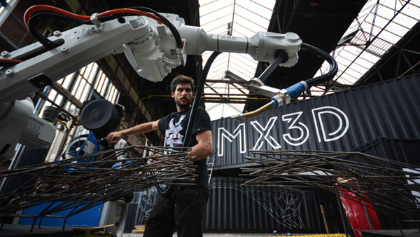 荷蘭公司MX3D開(kāi)發(fā)了一種創(chuàng)新的施工方法WAAM(電弧增材制造),該方法允許使用6軸機(jī)器人制造金屬結(jié)構(gòu)。該機(jī)器人每小時(shí)可沉積2公斤材料,這使得該技術(shù)特別適合建筑中金屬結(jié)構(gòu)復(fù)雜而細(xì)致的焊接工作。