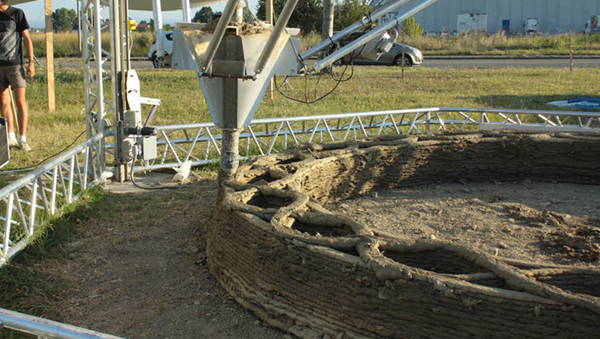 在歐洲,意大利人Enrico Dini使用他的D-Shape 3D打印機(jī)開(kāi)發(fā)了一種工藝。該系統(tǒng)基于粉末的使用,粉末通過(guò)“墨水”形式的粘合劑固化。在此過(guò)程中,沙子或骨料層沉積到所需的厚度,然后配備300個(gè)噴嘴的打印頭沉積粘合劑液滴,從而使沙子硬化。該機(jī)器呈立方體形狀,尺寸為4 x 4米,能夠創(chuàng)建最大6立方米的大型結(jié)構(gòu)。