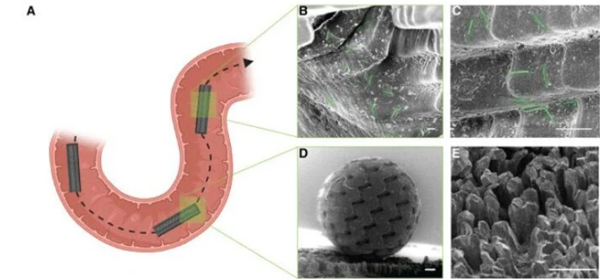 示意圖顯示CORAL中央膠囊穿過小腸組織的離體切片(左)和膠囊捕獲細(xì)菌的SEM圖像(右)。