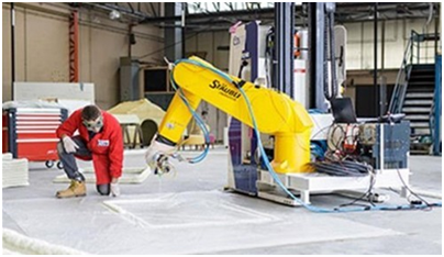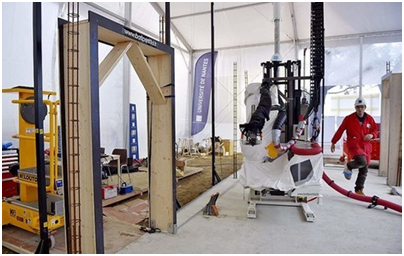 進(jìn)行施工的是一長(zhǎng)4米、有激光系統(tǒng)引導(dǎo)的機(jī)器人手臂,以聚合物絕緣體為原材料打印出墻壁的三層結(jié)構(gòu),分別是模板層、絕緣層和結(jié)構(gòu)層:前兩層有泡沫形態(tài)的材料制成,結(jié)構(gòu)層則是特制的混凝土層,該層最終被放置于模板層和絕緣層中間。